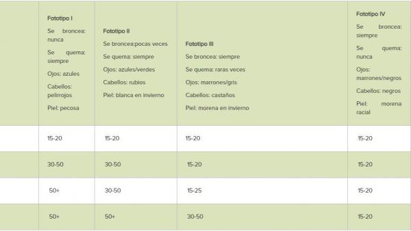 En su web ofrece esta tabla que indica el factor de protección según el tipo de piel y los valores del UVI (índice de radiación ultravioleta):